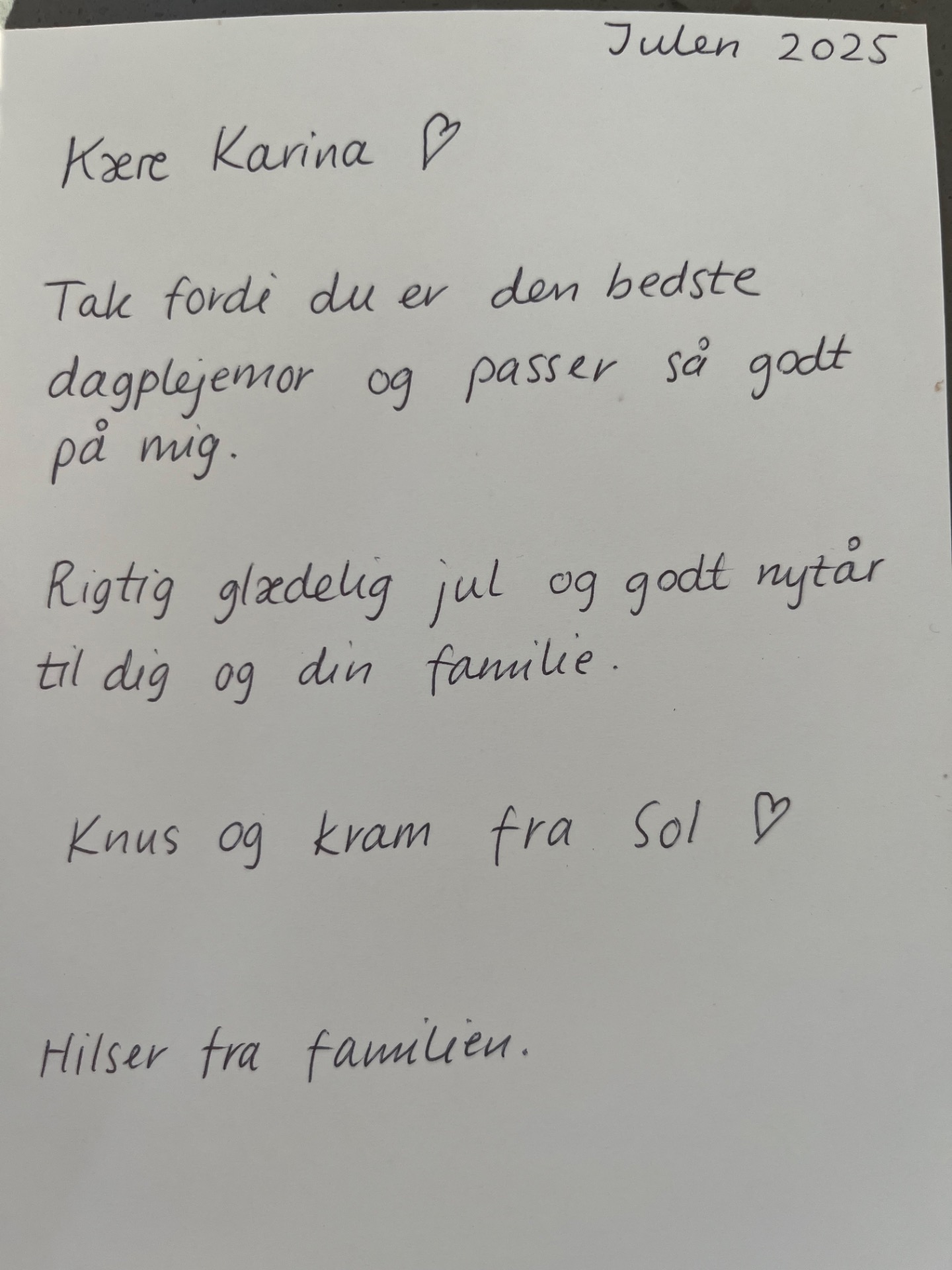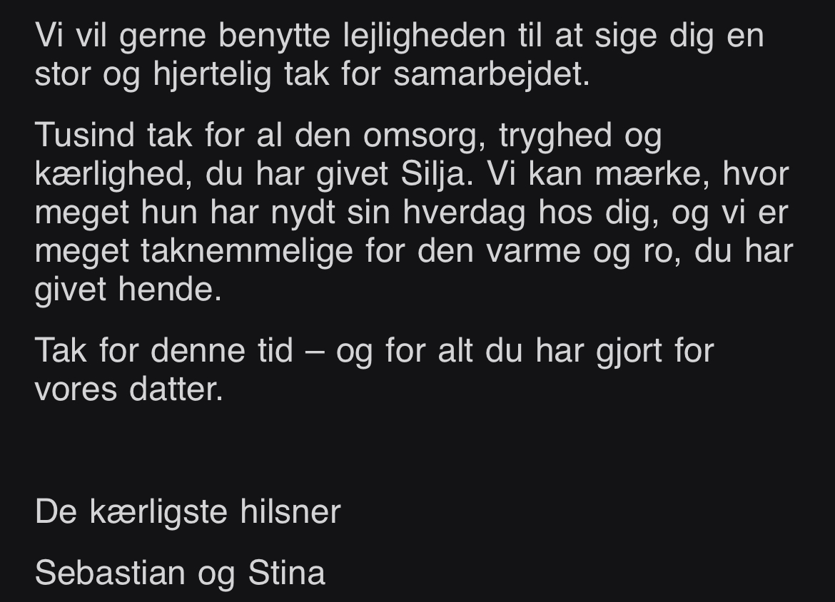 Jeg er XXX's mor som du havde i vuggestuen. Ville bare sige tak for din opmærksomhed omkring hende.